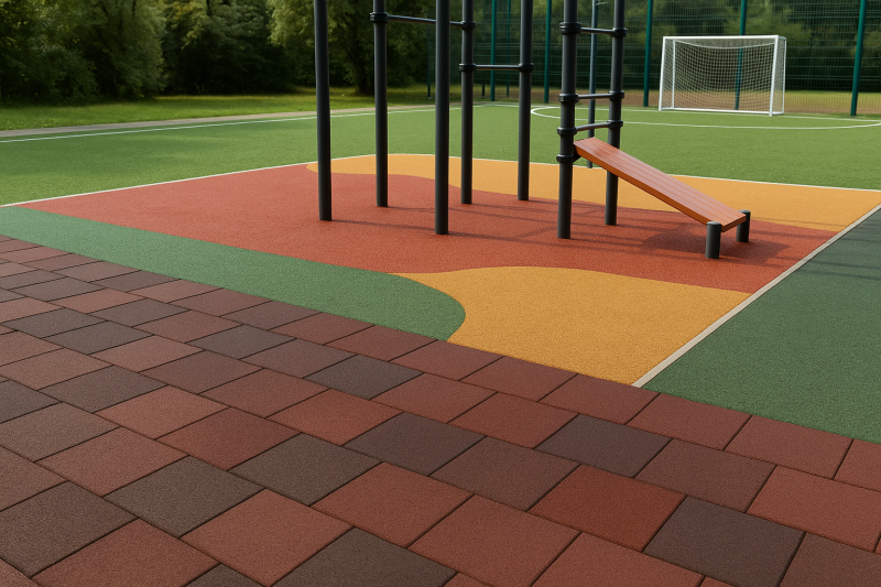 Один из самых востребованных вариантов — резиновая плитка. Её выбирают благодаря отличным амортизационным свойствам: падение на такую поверхность значительно безопаснее, чем на бетон или асфальт. Кроме того, плитка хорошо переносит климатические нагрузки: не трескается на морозе, не выгорает на солнце, устойчива к влаге. Ещё одно достоинство заключается в простоте ремонта. Если отдельный сегмент повредился, его можно заменить без демонтажа всей площади, что особенно удобно при эксплуатации в местах с высокой нагрузкой.